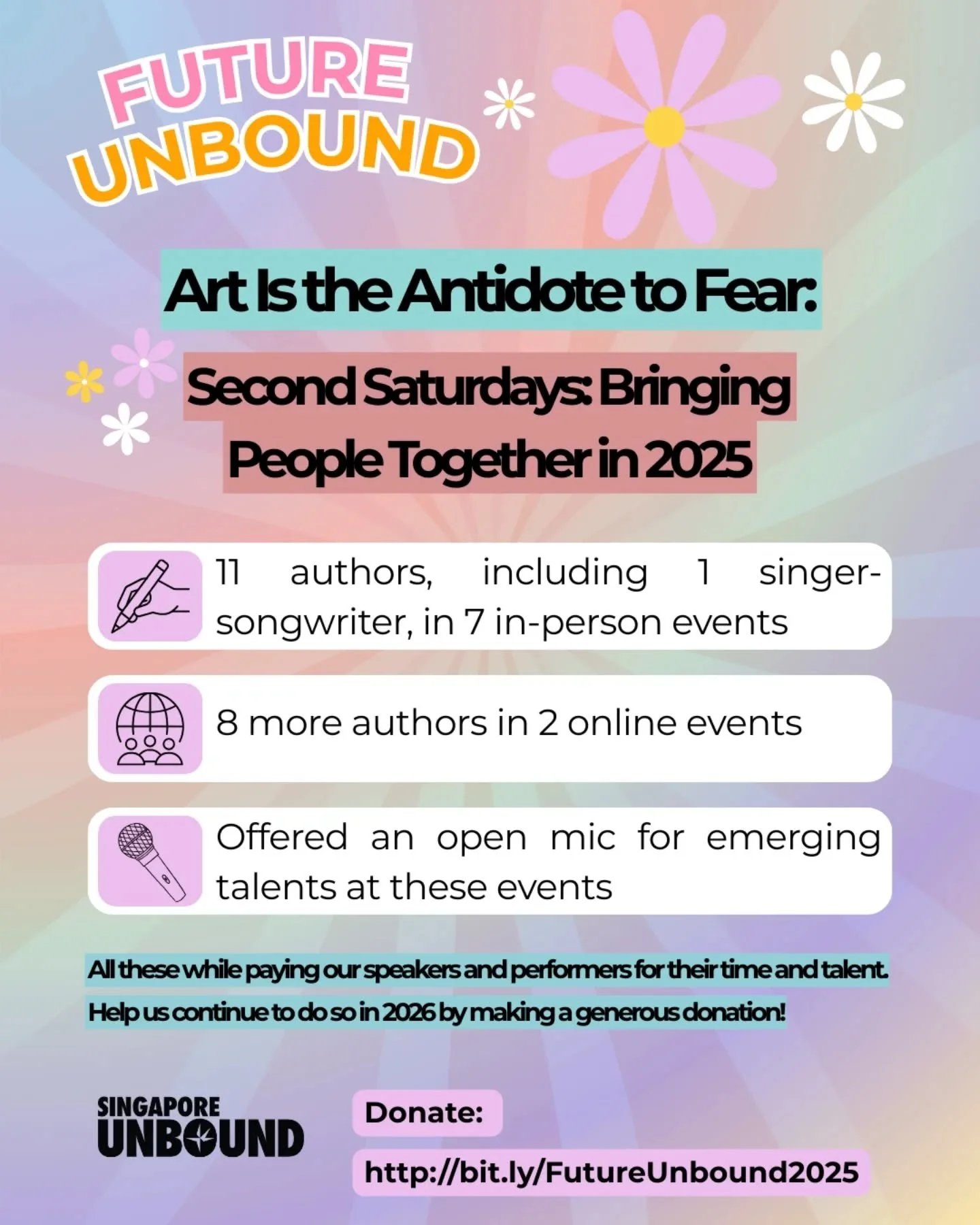 A transnational literary organization based in New York City, Singapore Unbound envisions and works for a creative and fulfilling life for everyone through the arts and activism.