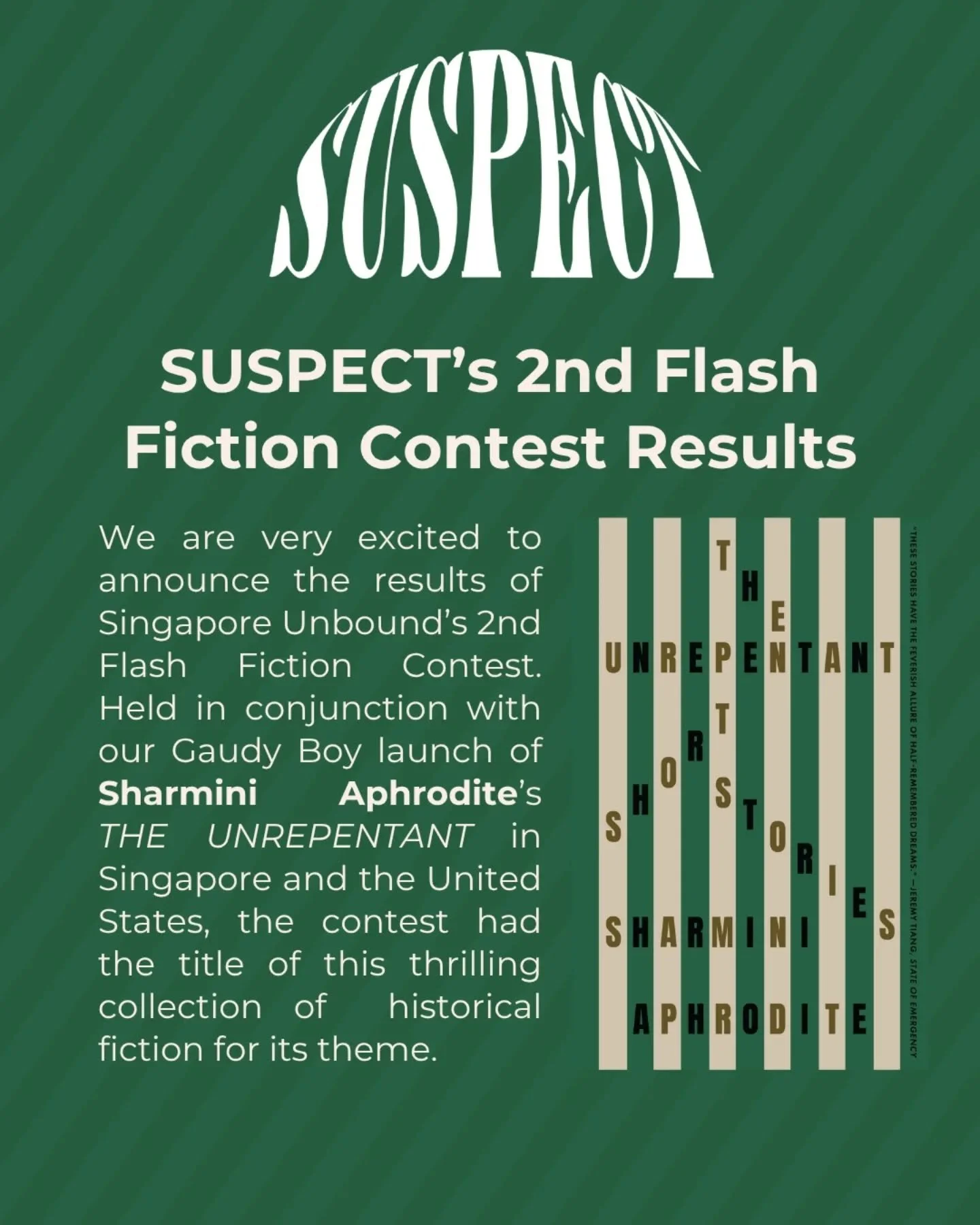 In conjunction with Gaudy Boy’s November 2025 publication of Sharmini Aphrodite’s THE UNREPENTANT, SUSPECT is holding its 2nd flash fiction contest with a call for submissions inspired by the title of this bold story collection. We are looking for flash fiction of 100-150 words on the theme of unrepentance interpreted in any imaginative way.