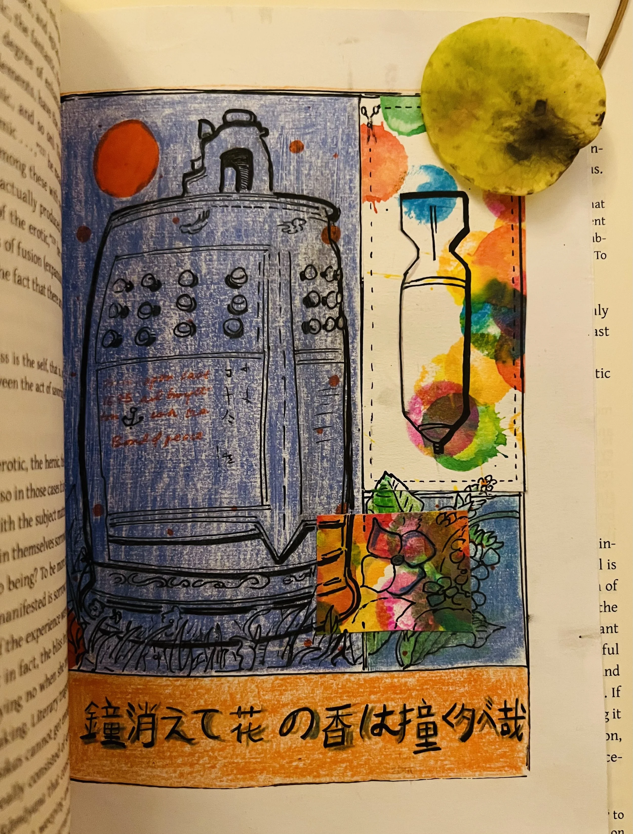 Image description: The illustration is tucked between the pages of a book, with a yellow petal placed on its top right corner. A traditional temple bell is sketched in black ink, against a blue background. Colorful, floral patterns are in the bottom right corner of the illustration. A simple drawing of a nuclear bomb is framed by dotted lines. At the bottom of this illustration is a line written in Japanese.