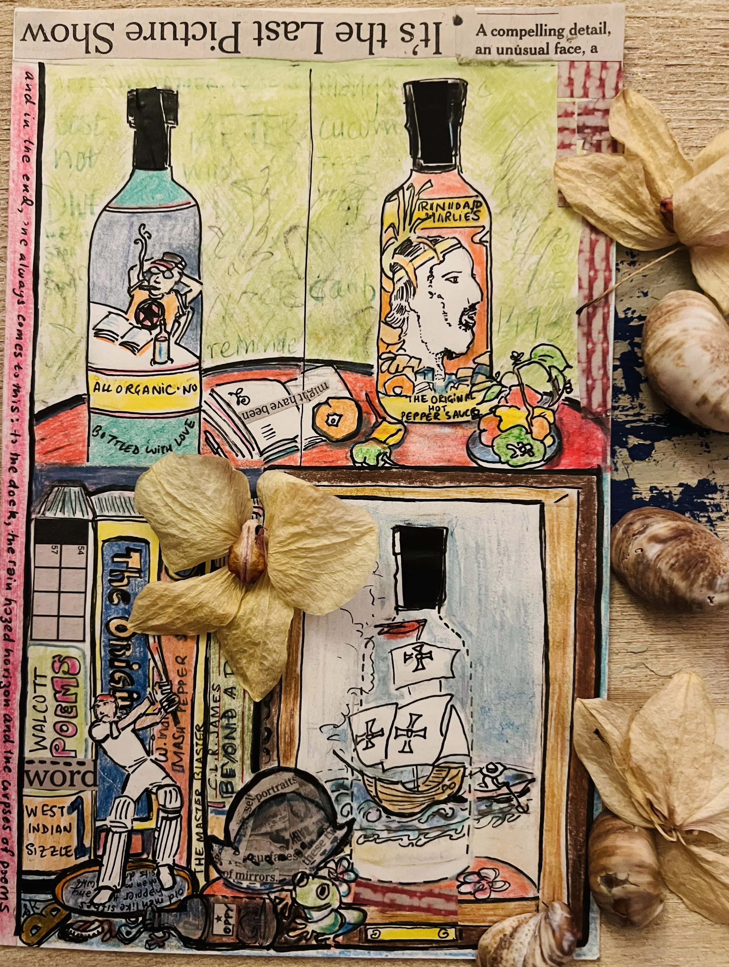 Image description: The mixed-media collage consists of illustrations, cutouts of printed words, and an arrangement of organic materials such as flowers and shells. The illustrations depict three bottles with vivid drawings of human figures and a boat; a baseball figurine is depicted in front of several books.