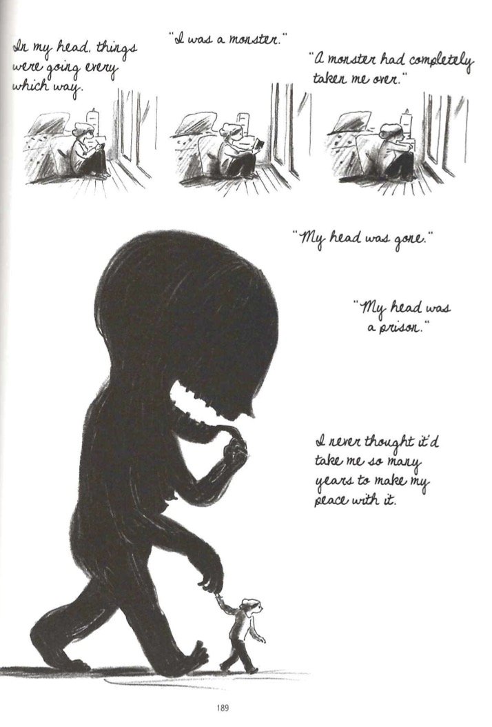 To wrest back control of her life, Durand turns to drawing—expressive, charcoal artwork, with heavy shadows standing in for places her memory can’t access. When the page darkens, you feel your mind cowering in the dark with it.
