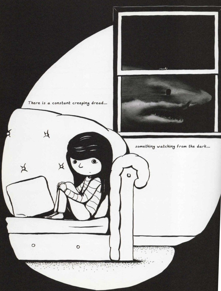 The shark is, of course, that monster under the bed that children cry “Wolf!” about when they can’t articulate their fears. Here, Wyld isn’t so much concerned about sharks as how the fear of them fin(d)s its way into her psyche.