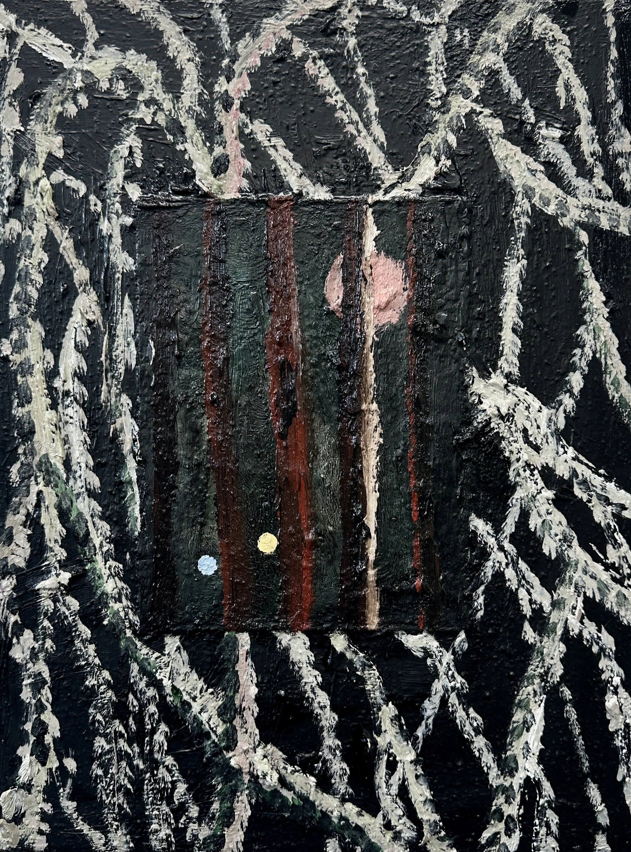 Image description: White painted branches in a circuit-like design against a dark ground with a central rectangular, window-like inset: the abstract inset image suggests a pinkish full moon behind vertical tree trunks, much like a moonlit forest painted in dark green and sienna.
