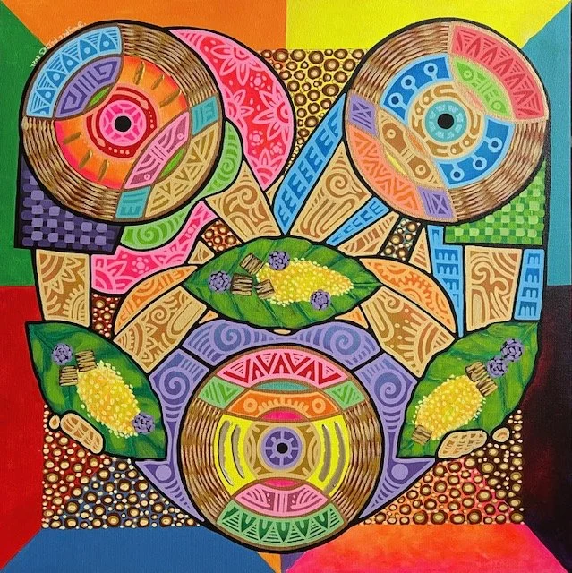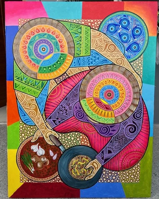Image description: The painting features abstract, geometric shapes that form three human-like figures, as viewed from above. Their arms reach out towards each other, forming interlocking patterns. The figures seem to be holding large, green leaves, on which are various traditional foods. The figures sit on a dot-patterned background featuring various shapes rendered in vibrant yellow, orange, red, blue, and green.