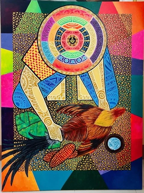 Image description: The abstract painting features various colorful, geometric shapes that form the figure of a person, as viewed from above. The figure’s head takes the form of concentric circles; their forearms, pants, and feet are rendered in spirals, circles, and lines. The figure holds a rooster by its tail; the rooster is rendered in a naturalistic way, unlike the rest of the abstract painting. The figure and the rooster are rendered against a dot-patterned middleground and a background featuring vibrant shades of pink, blue, green, orange, and purple.