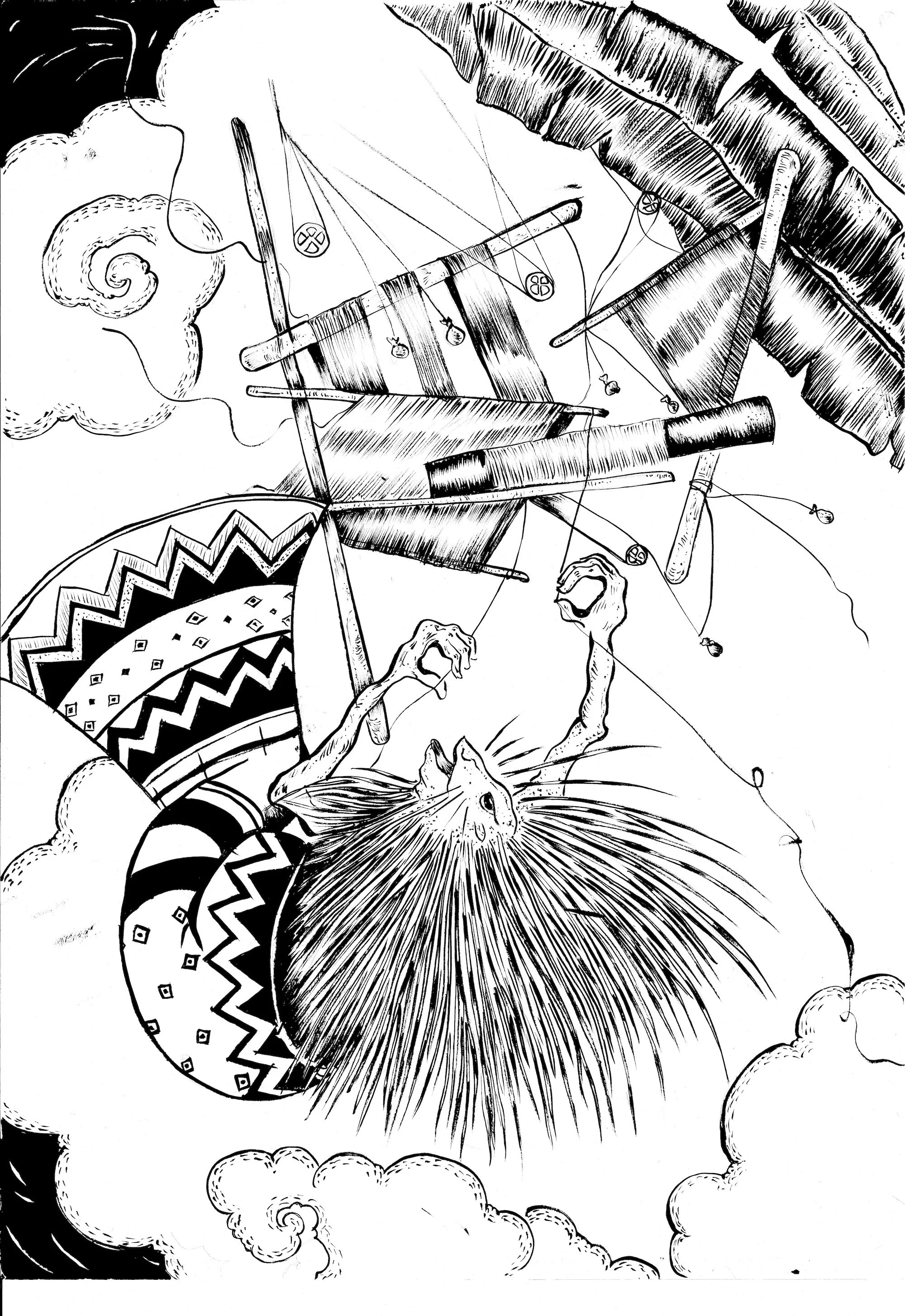 Image description: Section of a fine line drawing in black ink on white ground showing a porcupine-like creature emerging from a vase with geometrical designs, falling through tumultuous skies of stylized clouds, falling objects, and a banana tree leaf.