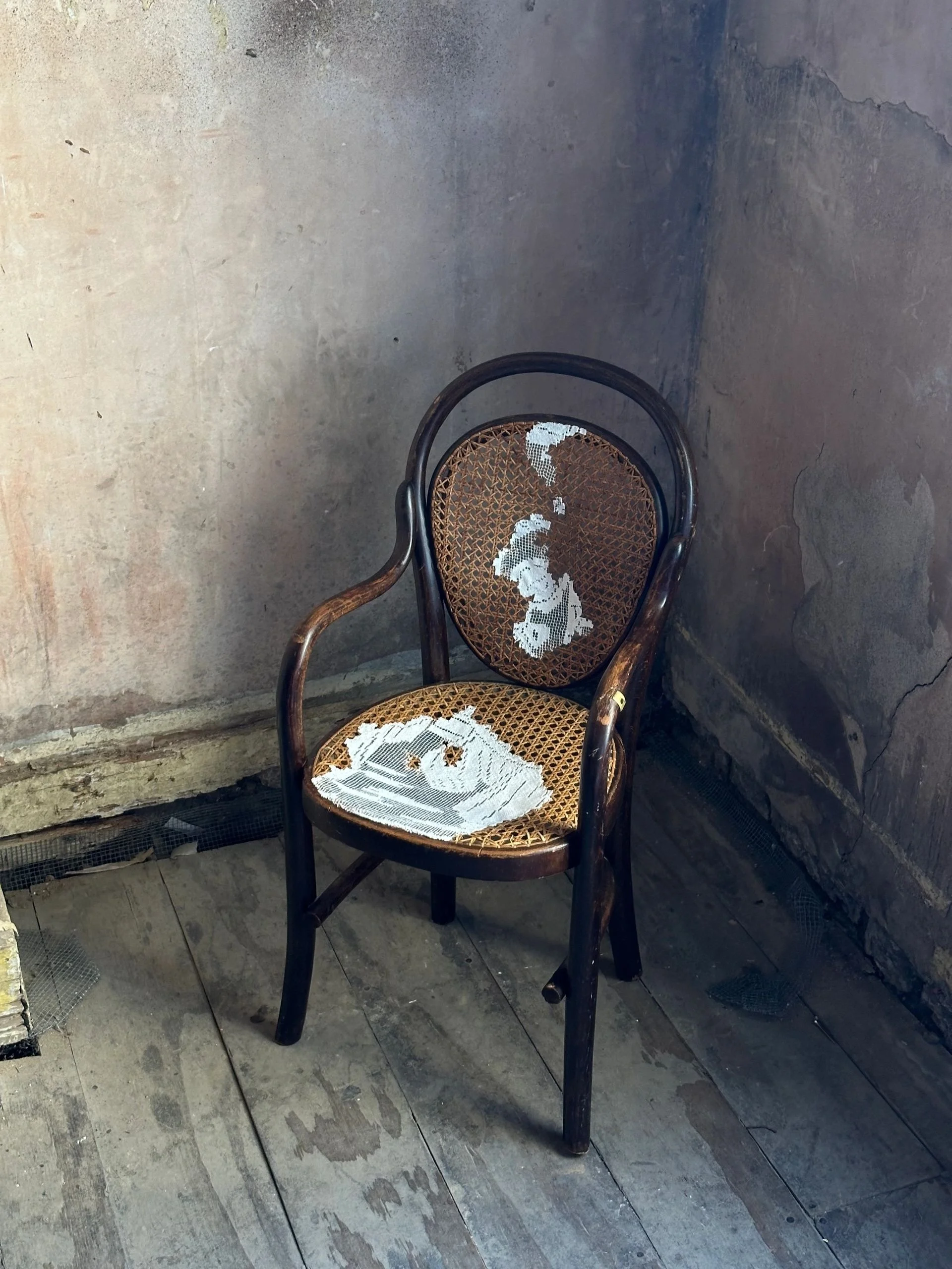 Image description: Classic wood and rattan cafe chair placed in a darkened corner with white lace piece-work draped on its back and seat.