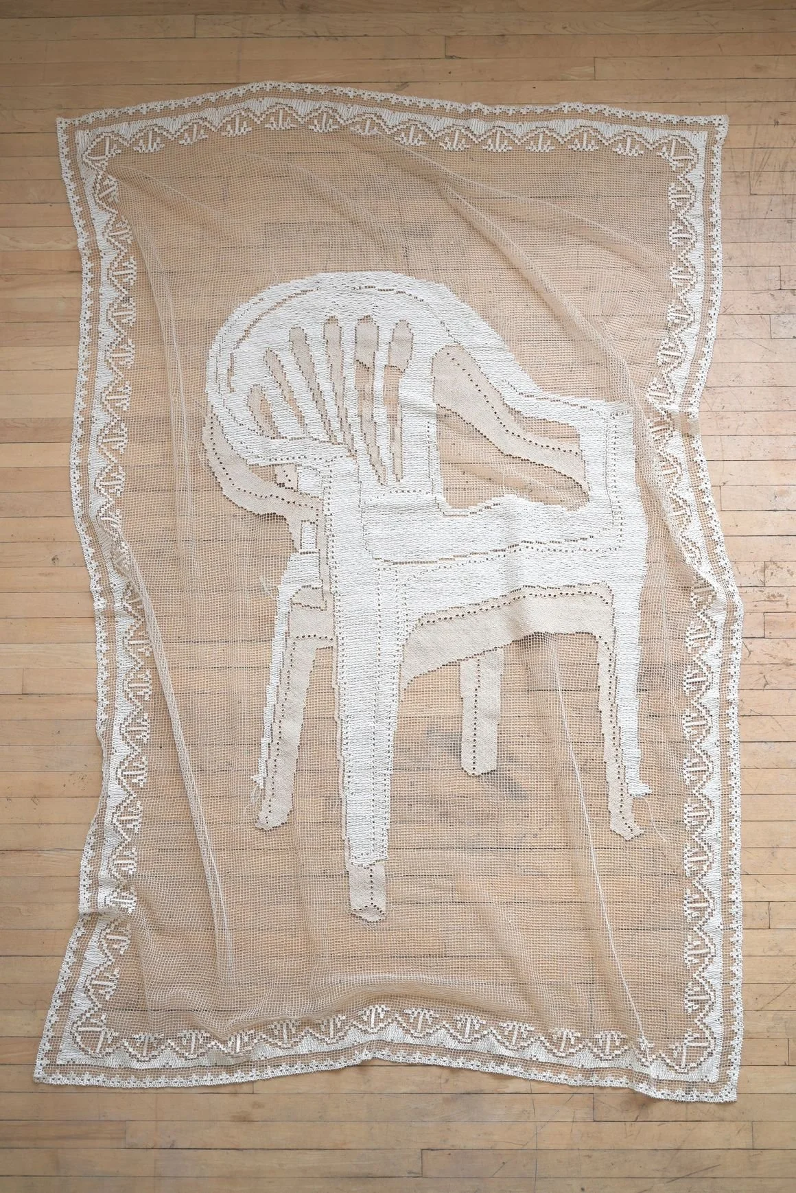 Jingyi Li, Obedient Objects - Chair, 2024. Handmade filet lace, vintage chair.